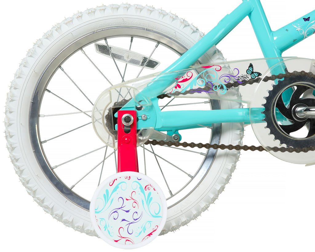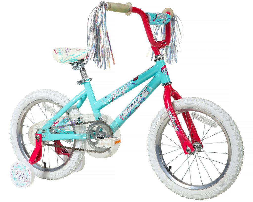 Sparkle and shine while riding on the Ozone 500 Blaze 16” Bike. Fun shades of pinks and teal paired with colorful handlebar streamers will make her next ride a showstopper. Coaster brakes make stopping easy and smooth while the removable training wheels add an extra level of comfort until she’s ready for an independent cruise. TheOzone 500 Blaze 16” Bike will make any girl feel like a gem!