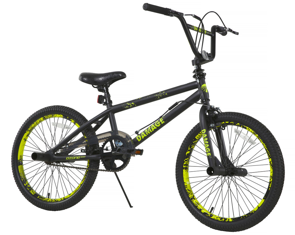 Crush the competition with the Ozone 500 Damage 20-inch Bike by Dynacraft. This BMX-style bike is built for kids who like to live their life to the extreme. With a deluxe black paint finish, edgy Damage decals, and a grunge yellow paint effect, this ride is the perfect way to command the bike lane. The Ozone 500 Damage comes complete with front and rear foot pegs, an admired staple of BMX bikes. Safety is always in your child’s hands with the powerful U-Brakes and handlebar brake levers for full stopping control. Make your bike rides truly radical with the Ozone 500 Damage 20” Bike.