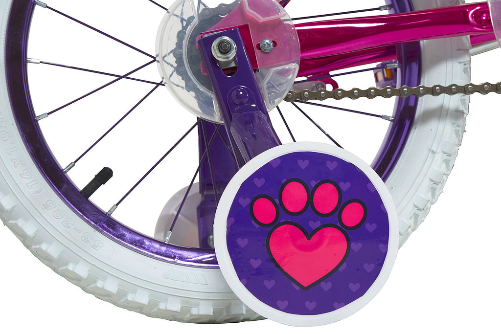 This 16-inch Barbie Bike is tailor-made for young girls who'll absolutely love riding in style. With its chic pink and purple color scheme, vibrant Barbie graphics, and a handy handlebar basket, it's designed for fun and practicality. The removable training wheels feature adorable heart-shaped paw prints, and the hot pink chrome frame is sure to bring a smile to any girl's face. Plus, there's a bonus surprise - a Barbie Plush Puppy included, ensuring your little one never rides without her furry friend!