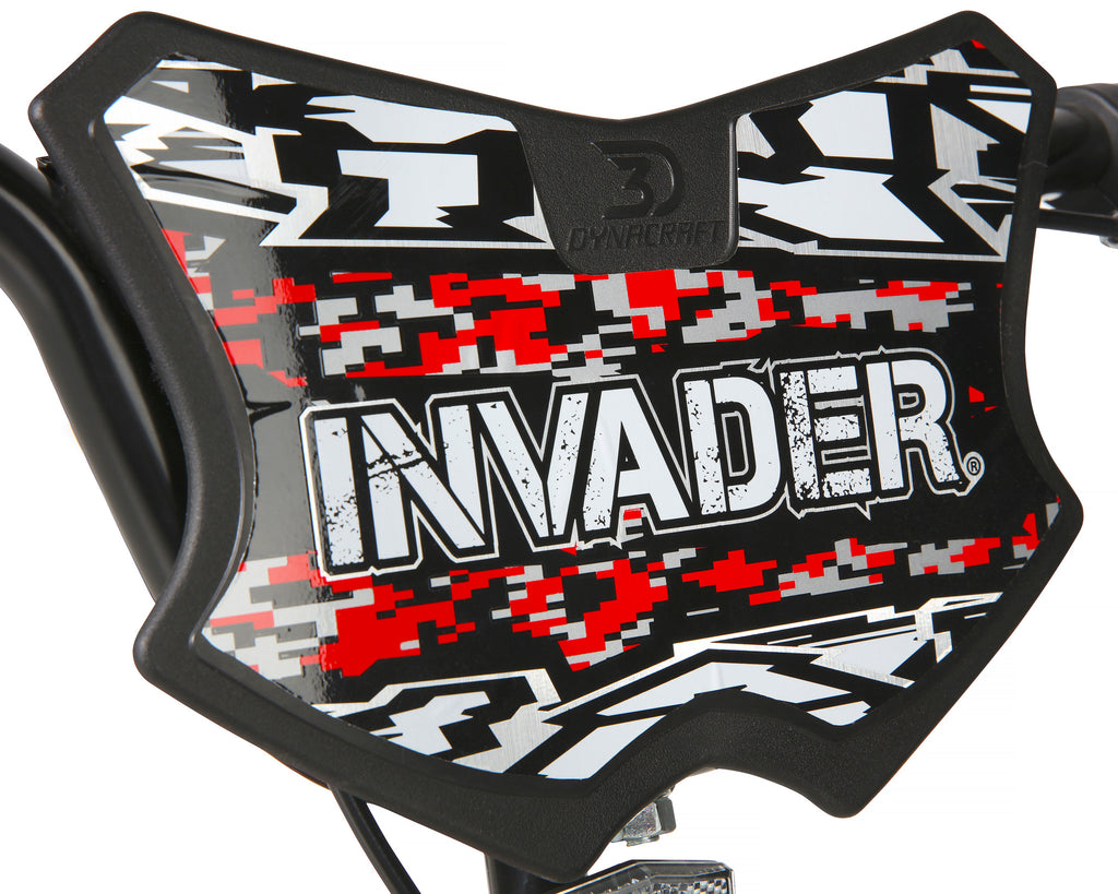 Take over the sidewalks in style with the sleek and bold Dynacraft Invader 16-inch Boys Bike. Featuring an eye-catching red-and-black Digi-camo paint finish on the frame, handlebar grips, and training wheels, this bike is sure to turn heads. The Invader-branded handlebar shield adds an extra touch of coolness as your young one cruises down the sidewalk. With an adjustable seat post, this bike can grow with your child, while the adjustable/removable training wheels provide an added layer of comfort until they're ready to ride solo. The rear coaster brake and front hand brake make stopping smooth and easy, ensuring your child's safety and confidence. Get ready to command attention with the radical Dynacraft Invader 16-inch Boys Bike.