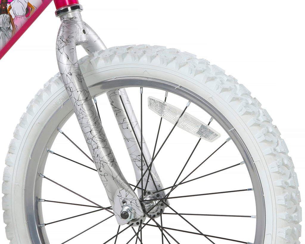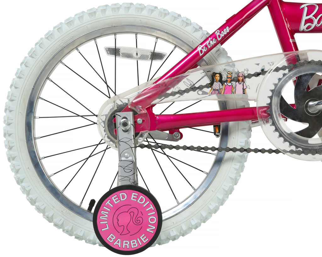 Dazzle and shine on the 18-inch Barbie Bike by Dynacraft, the ultimate girl’s bike that's as sparkly as it is stylish! Featuring a sturdy steel BMX frame with a deluxe pink paint finish and authen...