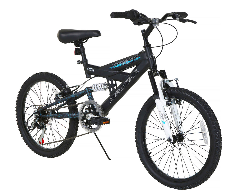 Attention all adventurous young riders! Get ready to crush it on the 20-inch Air Zone Aftershock Dual-Suspension Youth Mountain Bike by Dynacraft. If you're looking to ride on more than just a blacktop, this bike is the perfect step up for you. With front and rear suspension, you can now enjoy a smooth ride even on the toughest terrains. The six-speed grip shift is simple to operate and provides great shifting options, making it easy to get gnarly on the gravel and dirt. You can stay safe and in control with the solid linear pull brakes and the front cog guard. The quick-release seat post and solid steel kickstand make setup a breeze. The deluxe matte black and blue paint finish is sure to turn heads on the trail. So get ready to explore the path less traveled with the Air Zone Aftershock Mountain Bike!