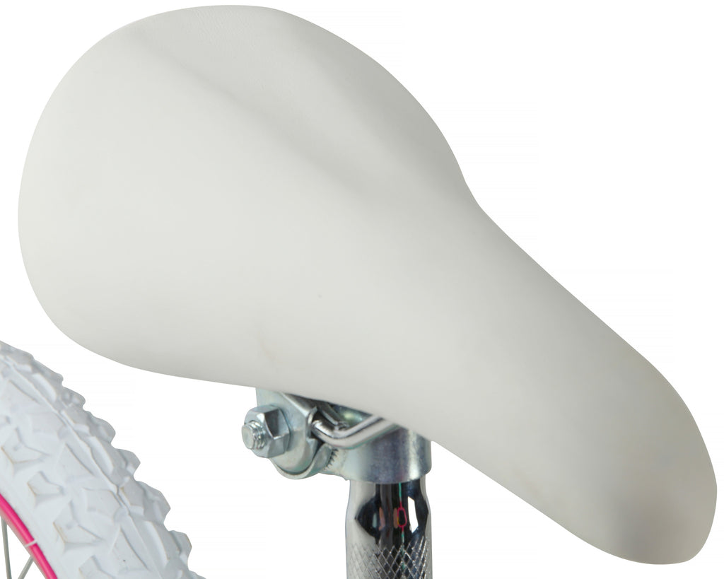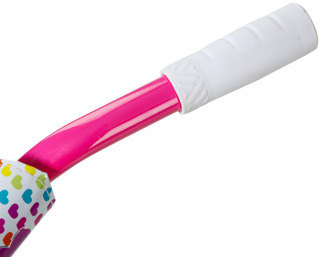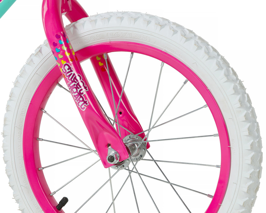 Your little one will experience nothing but the sweetest rides on the Magna Sweetheart 16-inch Girls Bike by Dynacraft. This bike is sure to capture attention with its eye-catching color scheme. The frame features a beautiful teal paint finish accented by pink handlebars and training wheels. Colorful details and custom graphics on the handlebar pad, top tube pad, and chain guard are all decked out with pops of yellow, blue, and purple. Coaster brakes make stopping easy and removable/adjustable training wheels help ensure a fun and steady ride for those just learning to ride. The 16-inch tires make this a great option for young riders ages 4-8 years. Spread some love in the neighborhood on the Sweetheart 16-inch Girls Bike.