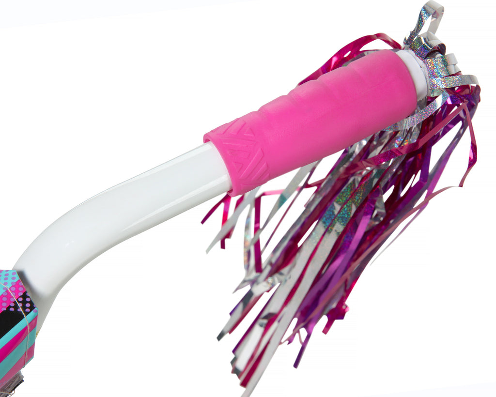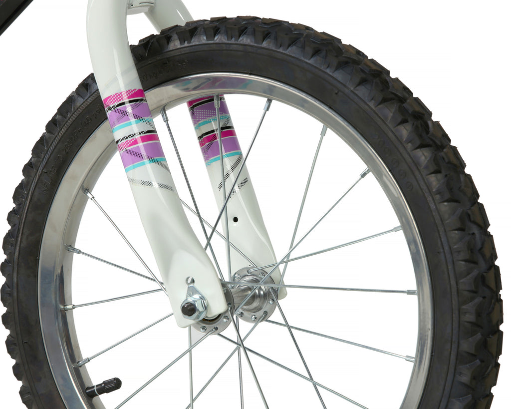 The Dynacraft Magna Sapphire 16-inch Girls Bike is designed to make young girls feel confident and cool while riding. The black paint finish on the frame, along with the white handlebars and fork, are the perfect base for the vibrant pink and teal details throughout the bike. The custom graphics and colorful details on the handlebar pad, top tube pad, and chain guard will catch the eyes of onlookers as she rides through the neighborhood. Shiny handlebar streamers that blow in the wind add some extra excitement to every ride. Coaster brakes make stopping easy and removable/adjustable training wheels help ensure a fun and steady ride for those just learning to ride. An adjustable seat post allows the bike to grow with her, too. The 16-inch wheels and overall design are great for children ages 4-8 years. The Magna Sapphire 16-inch Girls Bike is truly a gem of a bike for young riders ready to cruise on their own.