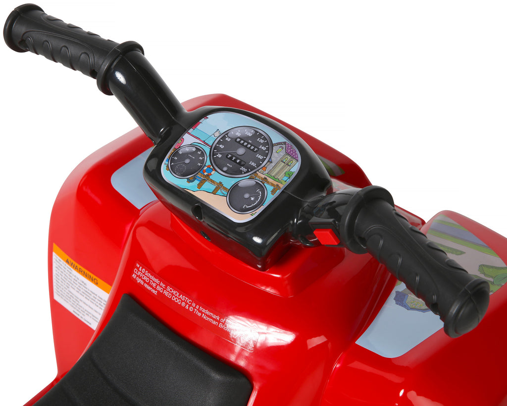 Introducing the Clifford 6 Volt Unisex Quad by Dynacraft, the perfect addition for your child's adventures! Clifford, the beloved childhood icon, is ready to become a part of your little one's world. This quad features captivating custom graphics of Clifford the Big Red Dog, handlebars that light up, and authentic Clifford sounds, creating an immersive playtime experience.