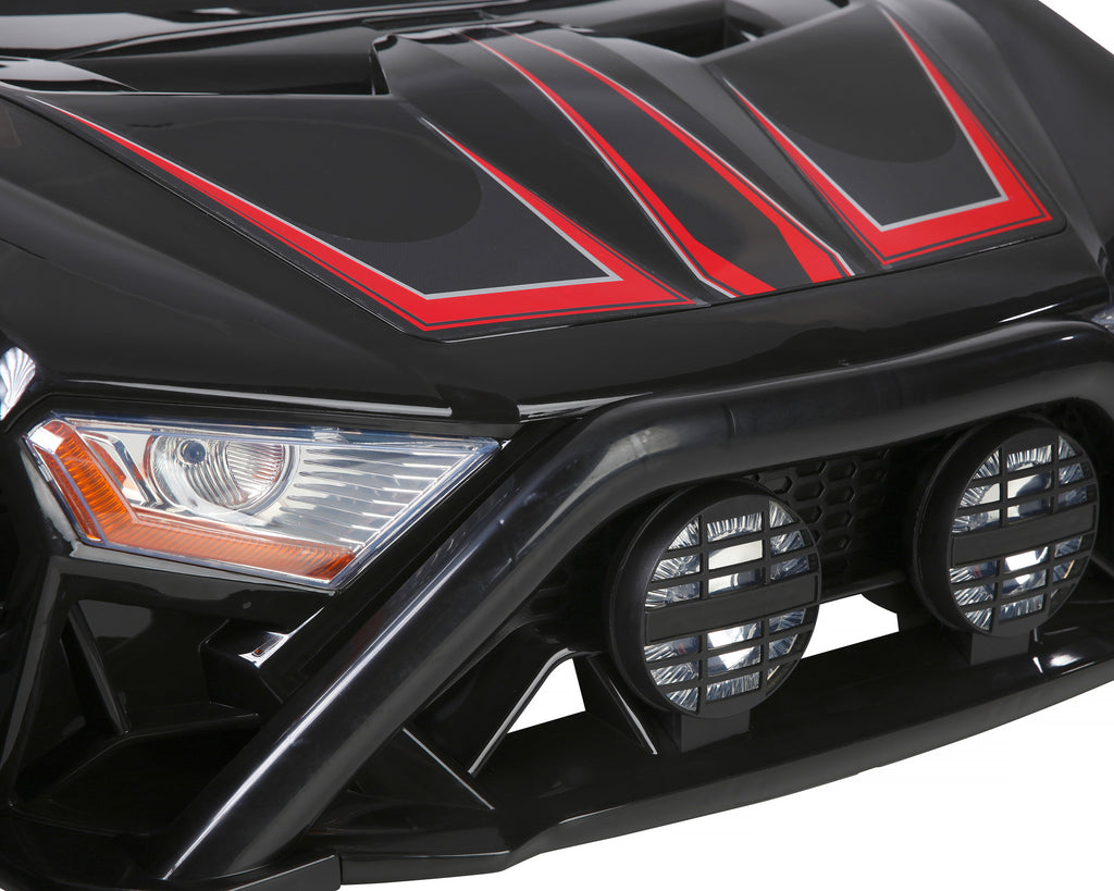 Prepare to turn heads as you fly by your neighbors on the 24-volt Trail Rider by Dynacraft. The red and black design featuring red fog lights, support bar, and hubcaps gives the car a super sleek ...