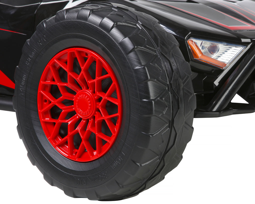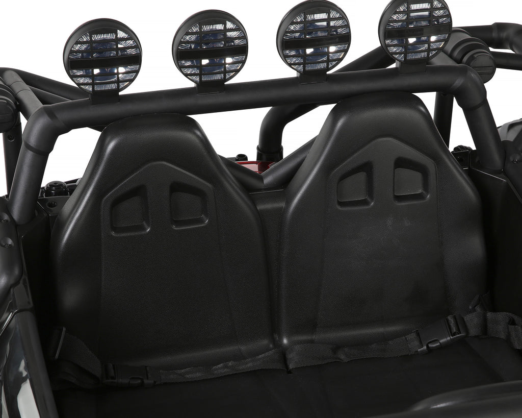 Prepare to turn heads as you fly by your neighbors on the 24-volt Trail Rider by Dynacraft. The red and black design featuring red fog lights, support bar, and hubcaps gives the car a super sleek and sporty look. A dashboard with a speedometer and fuel gage, working LED lights, and a MP3 input for music are just a few of the features this ride-on offers to give your child the experience of an authentic car or 4x4. Not to mention, your little one can discover new terrain with their sibling or best friend in this two-seater. They will take on the trails at their own pace with an easy-to-use foot pedal acceleration and speed up to 5MPH. For the most comfortable ride, the Trail Rider is recommended for children ages 3+ and a combined weight limit of 130 pounds. Grab your bestie, buckle up, and light up the trails in the 24-volt Trail Racer by Dynacraft!